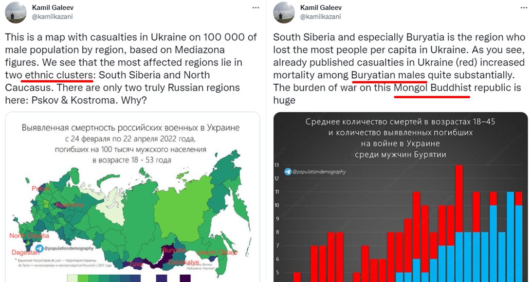 Наш сказ о том, как Камиль Галеев извратив наш контент (смертность на войне в Украине по регионам РФ) способствует распространению говно-теории о том, что Россия умышленно геноцидит свои этнические меньшинства, целенаправленно отправляя именно их воевать и умирать в Украине