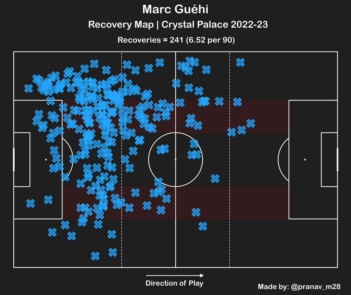 First look at his recoveries from that season and you can see someone who wins the ball a lot, puts in the work across the backline but mostly on the left flank and channel.
