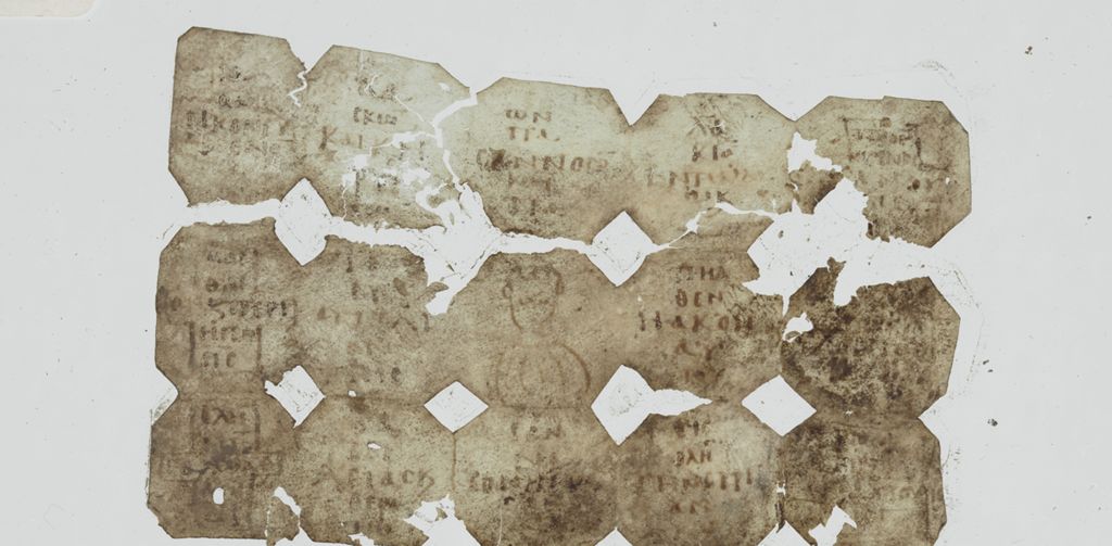Pertama adalah Papirus 1077 "Penyembuhan" yang berisi teks uncial Alkitab Matius 4:23-24, dibentuk dengan model segi lima sehingga membentuk salib kecil. Terlihat ada gambaran salib kecil juga dengan tulisan, ada sosok manusia di tengah (Yesus?). Mungkin penggunaannya dilipat?