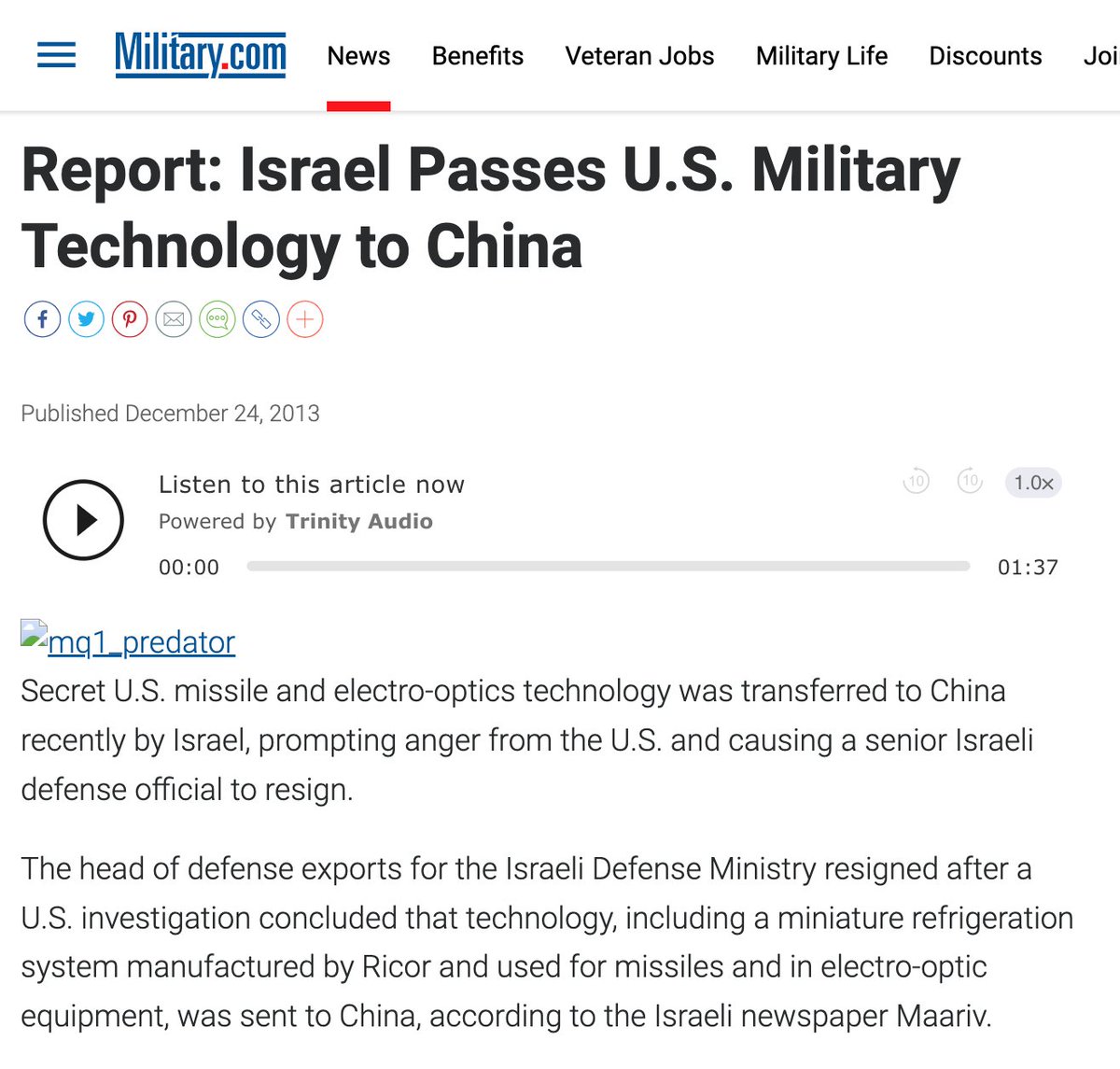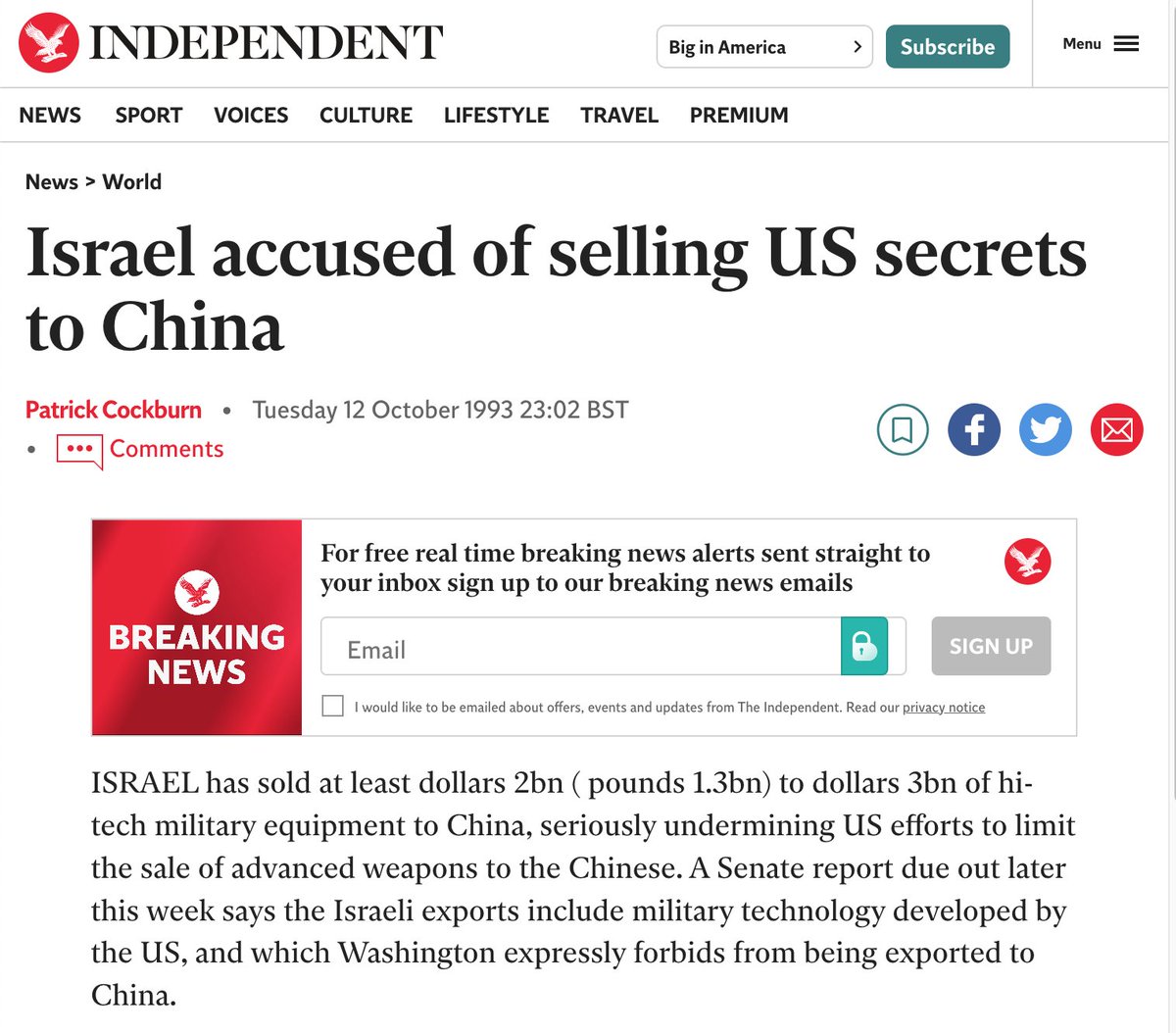https://twitter.com/AmiDar/status/1768457494290964789Some of the subtext here is a longstanding issue of Israel turning around and selling American military secrets to China -- which has happened a number of times since at least 1993.