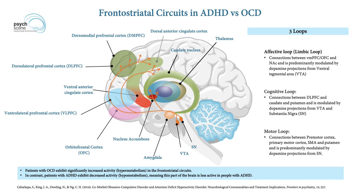 It’s impaired prefrontal regulation across distributed circuits (PFC–striatal–cerebellar–salience networks) that shape attention, inhibition, and emotion.