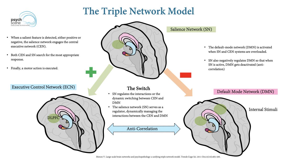 The answer lies in the breakdown of three large-scale brain networks: the salience network, the default mode network (DMN), and the central executive network (CEN).