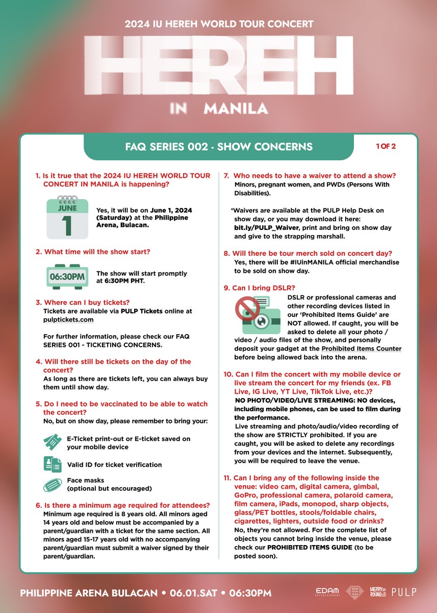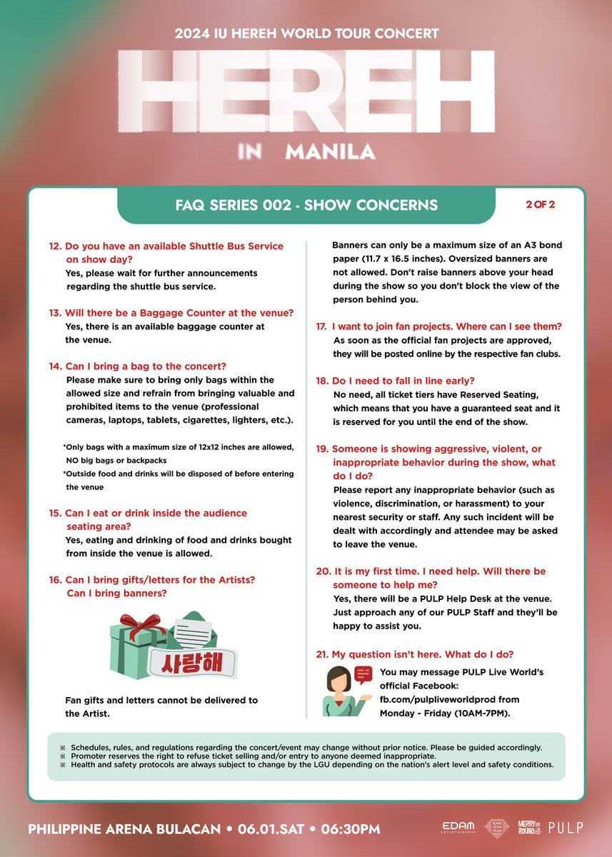 Shh...not anymore! 🥳 The Show FAQs for 2024 IU HEREH WORLD TOUR CONCERT IN MANILA (BULACAN) are also here! 👋 Share these with your fellow UAENA to keep everyone in the loop. We hope to see you all soon on June 1, 2024 at the Philippine Arena! 🥰
