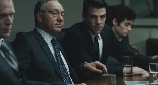 In the main boardroom scene where everyone is figuring out whether or not to sell securities, we see Kevin Spacey and Zachary Quinto wearing the standard investment banker uniform. A suit with a pointed collar and ties with muted colors.