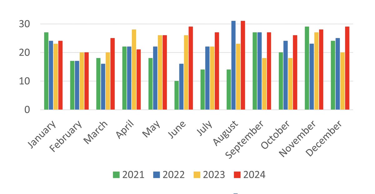 PLA aircraft crossed the median line on more days in 2024 than in any other calendar year on record. This figure has risen in the last four years, from 240 crossings in 2021 to 269 in 2022, 271 in 2023, and 313 in 2024.