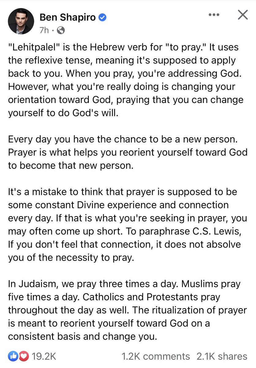 Shapiroās claim is that it doesnāt matter if anyone is actually listening to your prayers. What matters is if you reorient yourself toward God, whatever that means.https://twitter.com/NeilShenvi/status/1618244570541871106A nation founded on Christian principles is the only internally consistent structure that requires limited government for the purpose of protecting *God-given* RIGHTS (not state-given privileges). Without God, we cannot objectively define individual rights.