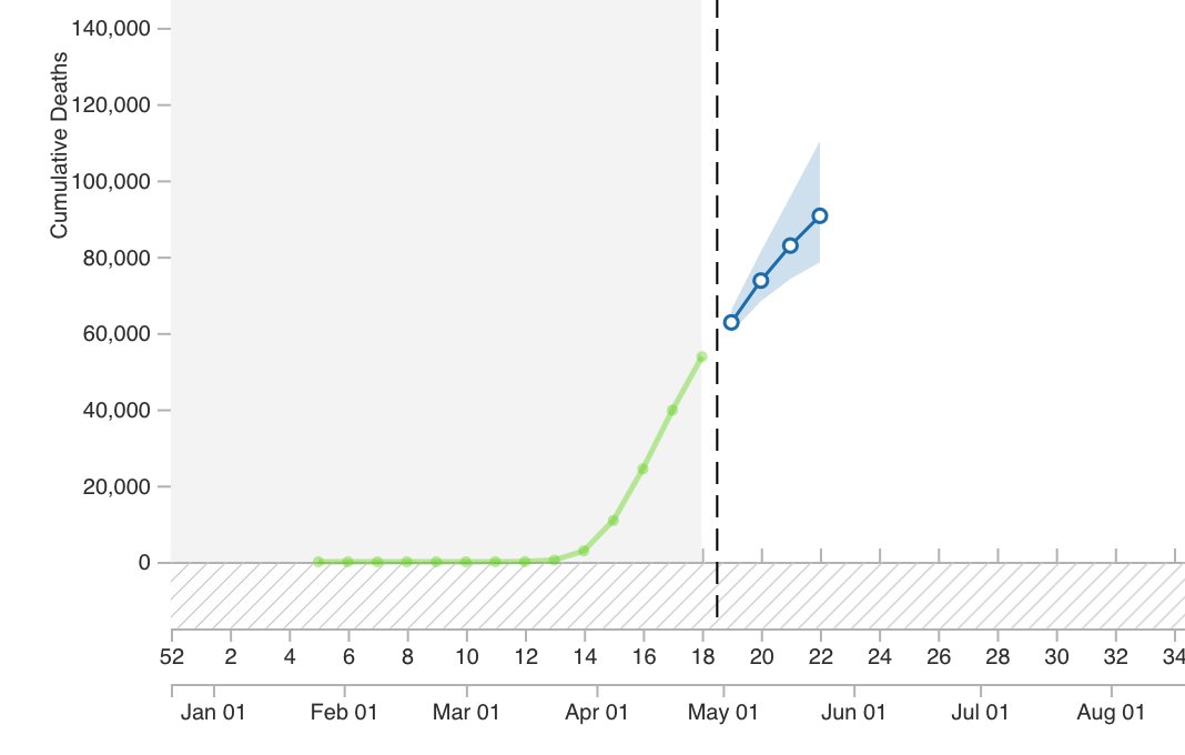 In general, the message of these models seems to be that #COVID19 is going to continue to exact a large toll in the US, with mortality by late May or early June likely to exceed even the upper-bound estimates of deaths caused by any recent flu season.