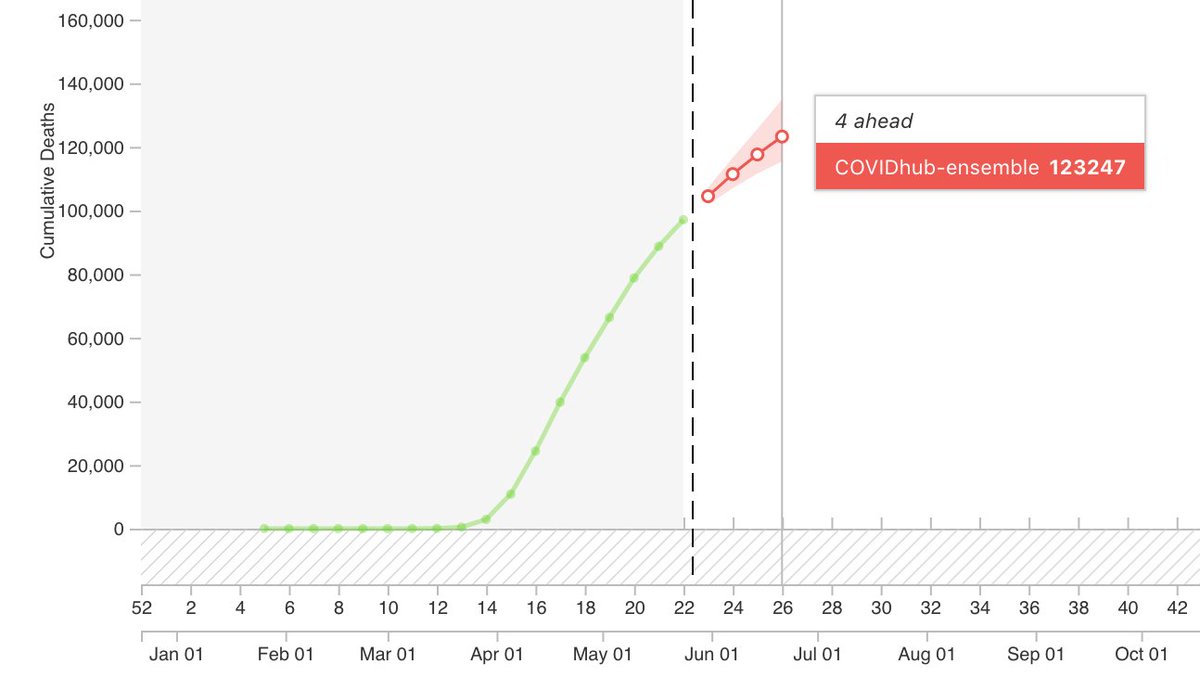 The ensemble says that by June 20 there is a 10% chance of seeing fewer than ~117K cumulative #COVID19 deaths in the US and a 10% chance of seeing more than ~130K.