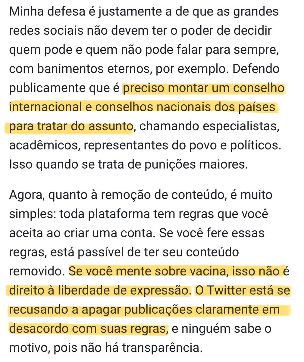 Ele disse que acreditava na importância da formação de conselhos nacionais e internacionais para julgar sobre censura e banimento de perfis e que o Twitter se recusava a cumprir as próprias regras porque “se tem alguém mentindo sobre a vacina, isso não é direito à liberdade de expressão”.