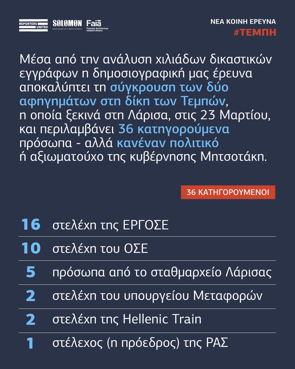 2⃣ Μέσα από την ανάλυση χιλιάδων δικαστικών εγγράφων η δημοσιογραφική μας έρευνα αποκαλύπτει τη σύγκρουση των δύο αφηγημάτων στη δίκη των Τεμπών, η οποία ξεκινά στη Λάρισα, στις 23 Μαρτίου, και περιλαμβάνει 36 κατηγορούμενα πρόσωπα - αλλά κανέναν πολιτικό ή αξιωματούχο της κυβέρνησης #Μητσοτάκη.