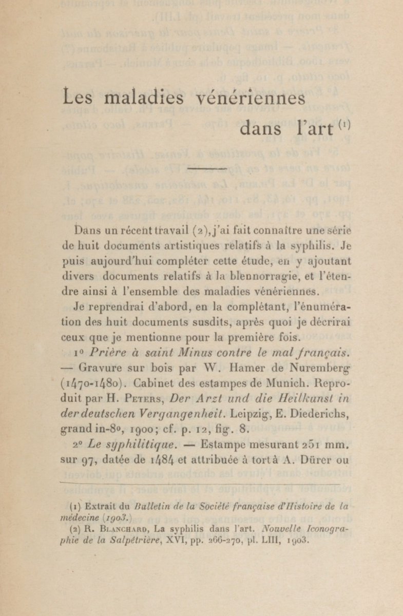 La sífilis, malaltia infecciosa congènita i de transmissió sexual, es va estendre per Europa a partir del segle XV. A vegades confosa amb la lepra, està extensament documentada i en tenim nombrosos testimonis escrits i gràfics, com els que va recollir Raphaël Blanchard (1903).