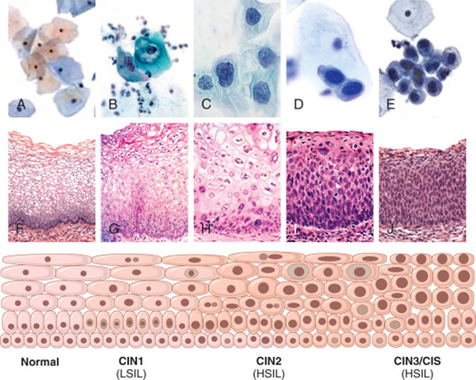 Na poniższych infografikach widać jak zmienia się nabłonek szyjki macicy i jego komórki jeśli przez 2-3 dekady proces postępuje. Wystarczy zablokować a nawet utrudnić 1 etap (zakażenie HPV), żeby zapobiec większości tych nowotworów.