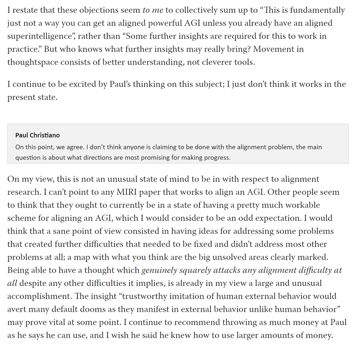 Like, yes, point taken, this feels like a bizarre situation to be in. And I agree with lesswrong.com/posts/uFNgRumr… that there are sane ways to slow progress to some degree, which are worth pursuing alongside alignment work and other ideas to cause the long-term future to go well.
