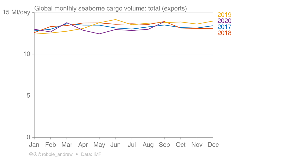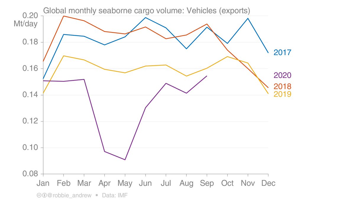 2/ It's clear that some types of cargo saw significant drops in the peak months of global lockdown, April and May, here vehicles. But this is a small category in terms of weight.