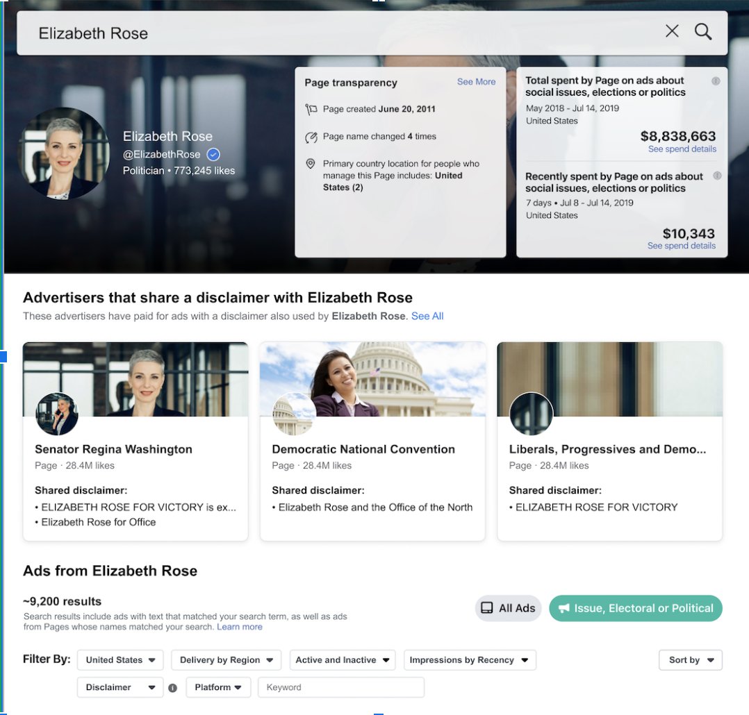First, when you go to a page view in the Ad Library, you’ll now see which other advertisers have run ads with a shared “paid for by” disclaimer. A shared disclaimer means the advertisers explicitly shared it via our tool & have at least one shared organization funding them (2/4)