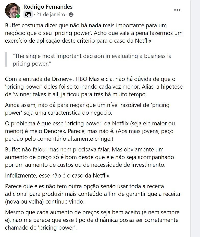 Nesse caso, um negócio tem qualidade na medida em que é capaz de trazer retornos acima do seu custo de capital.