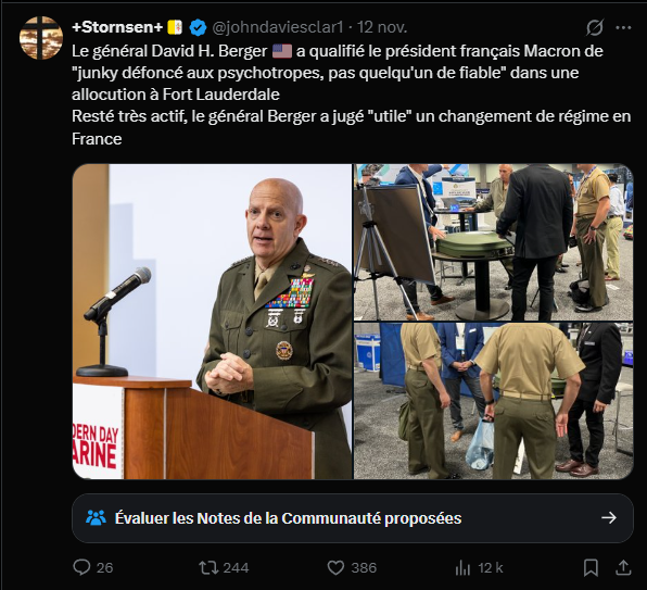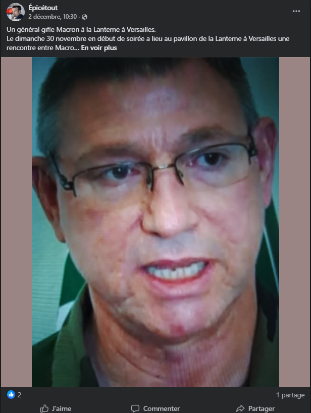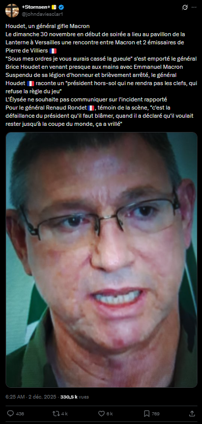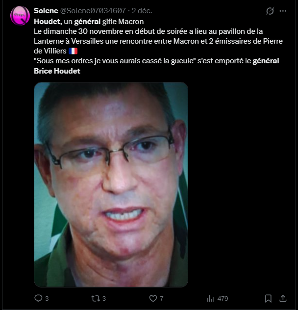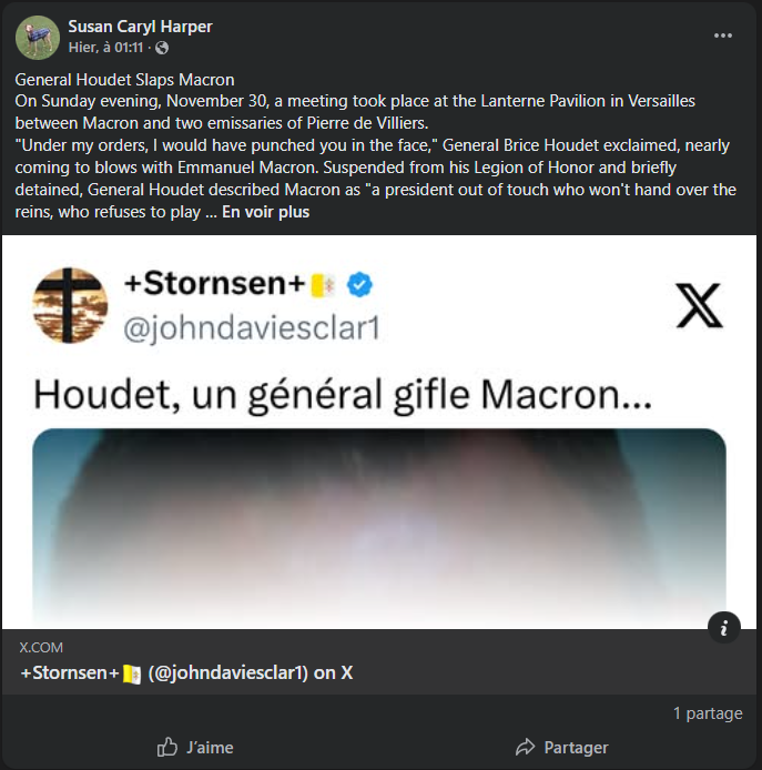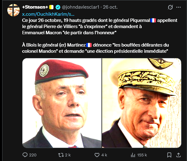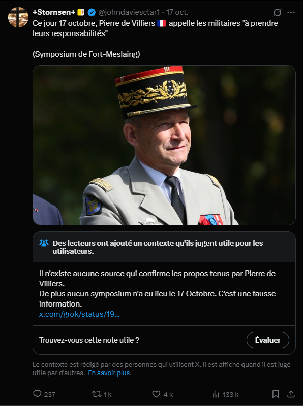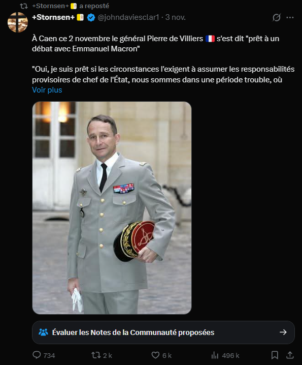 Le compte Stornsen a lancé le 17 octobre dernier tout un récit autour de généraux qui s'opposeraient à Macron. L'ancien CEMA, Pierre de Villiers, est en particulier mobilisé. Mais il invente des éléments avec d'autres gradés.