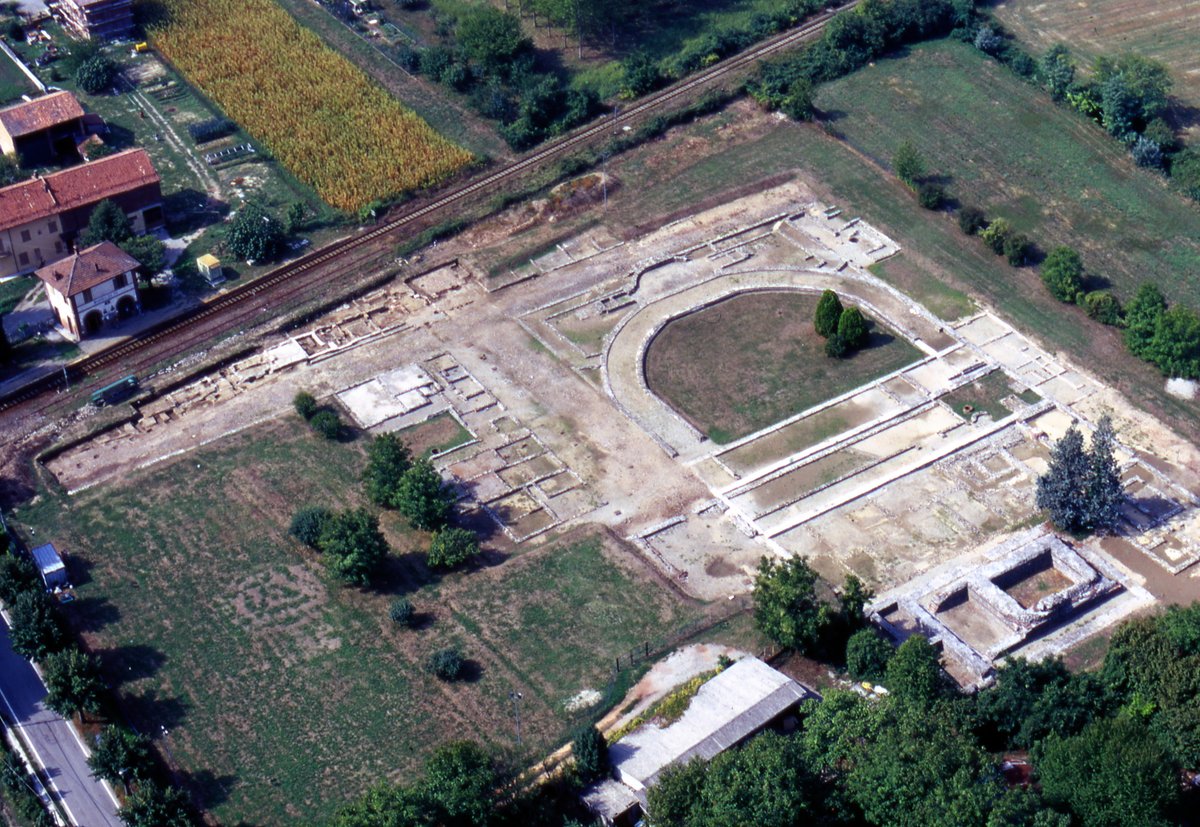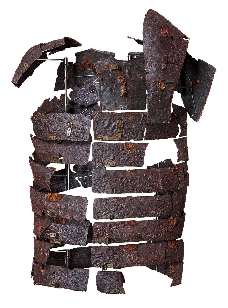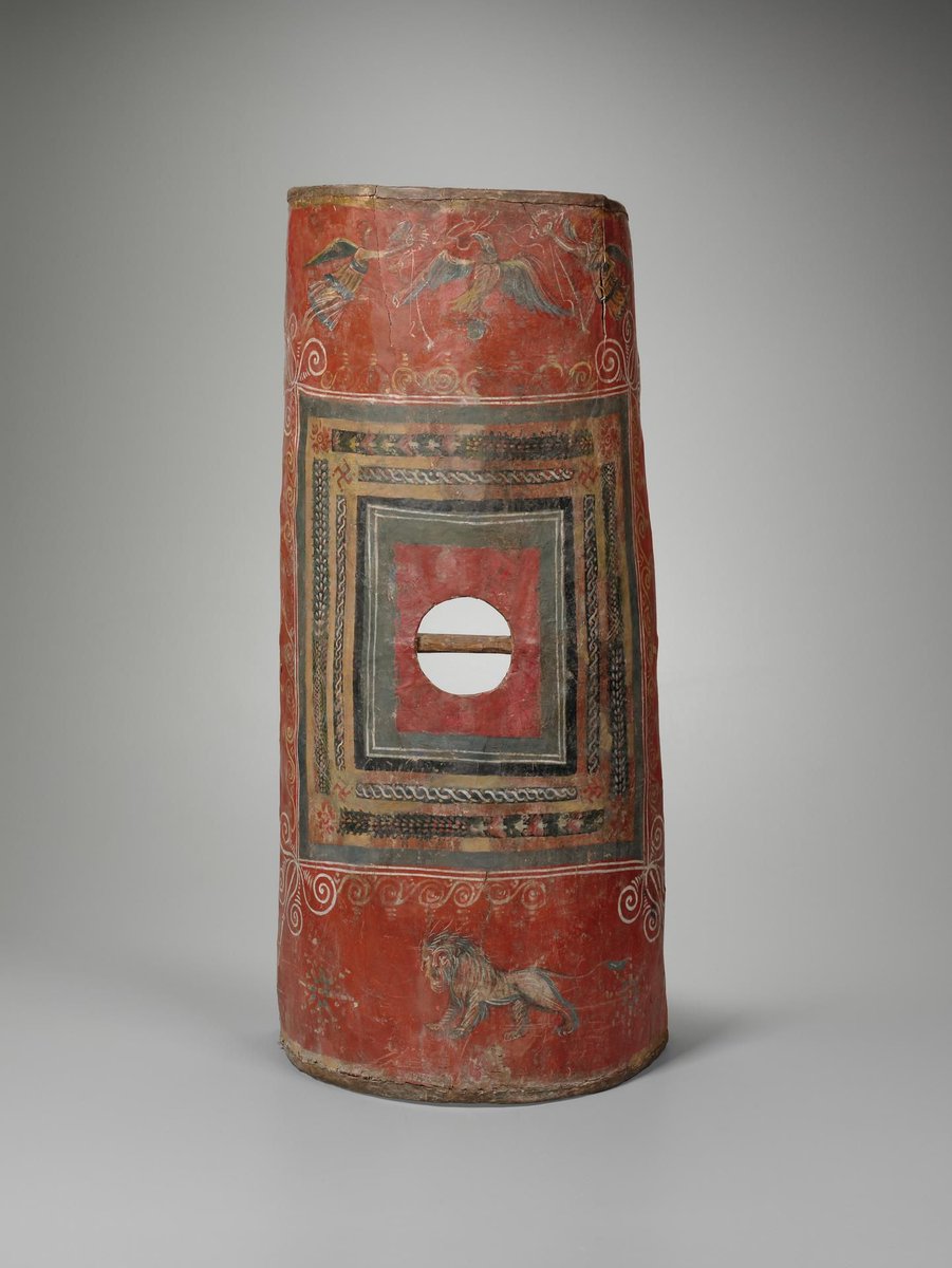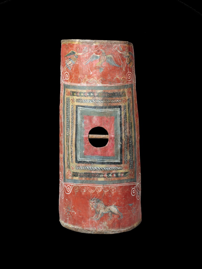 La ciudad de Dura Europos fue destruida por los sasánidas en el año 256 y en las excavaciones se encontraron muchos restos de las armas de la guarnición romana de la ciudad. El escudo apareció roto en 13 pedazos y se compone de 3 láminas de madera superpuestas sigue+