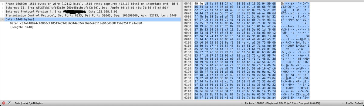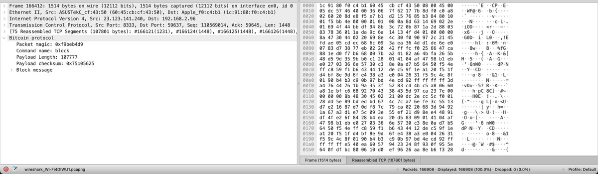 Check out this packet captures. It is clearly a bitcoin node downloading a block from a peer. It's so clear that wireshark will automatically stitch all the packets together and annotate it as a block.