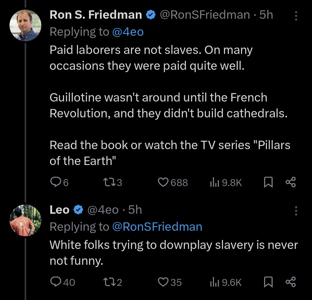 https://twitter.com/4eo/status/1825712470750646779Also more likely than not the tweet is just inspired by dumb Monty Python "hitting boards on head" depictions of a miserable Middle Ages, but to be more cynical I feel like it's kind of selling a "We built these streets!" third worldist "African slaves in medieval Europe" message