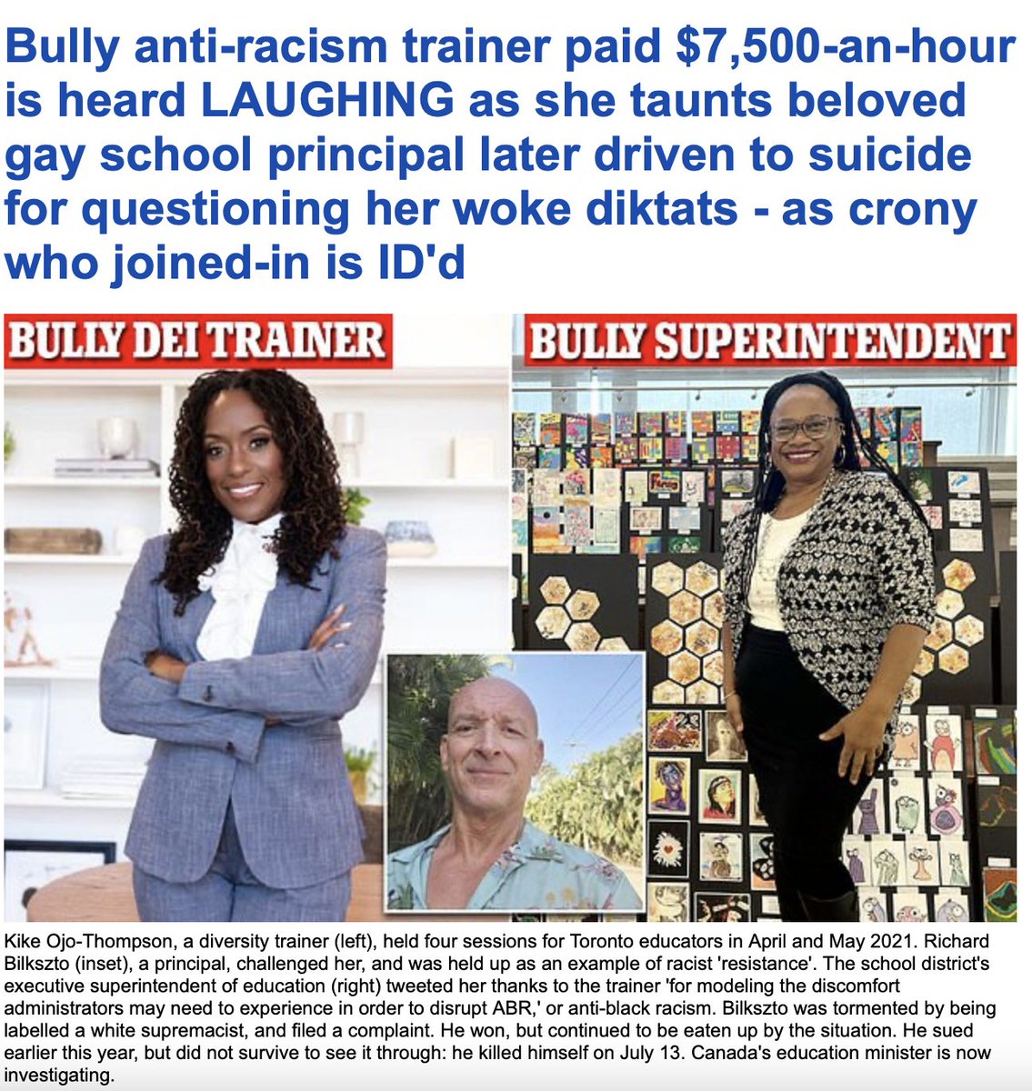https://twitter.com/TheFP/status/1687078153905209346Do listen to the audio excerpts we provide from the DEI training session and you'll hear how school principal Richard Bilkszto was bullied not just by the DEI trainer but by other educators. The event left him traumatized which eventually led to his suicide.… twitter.com/i/web/status/1…