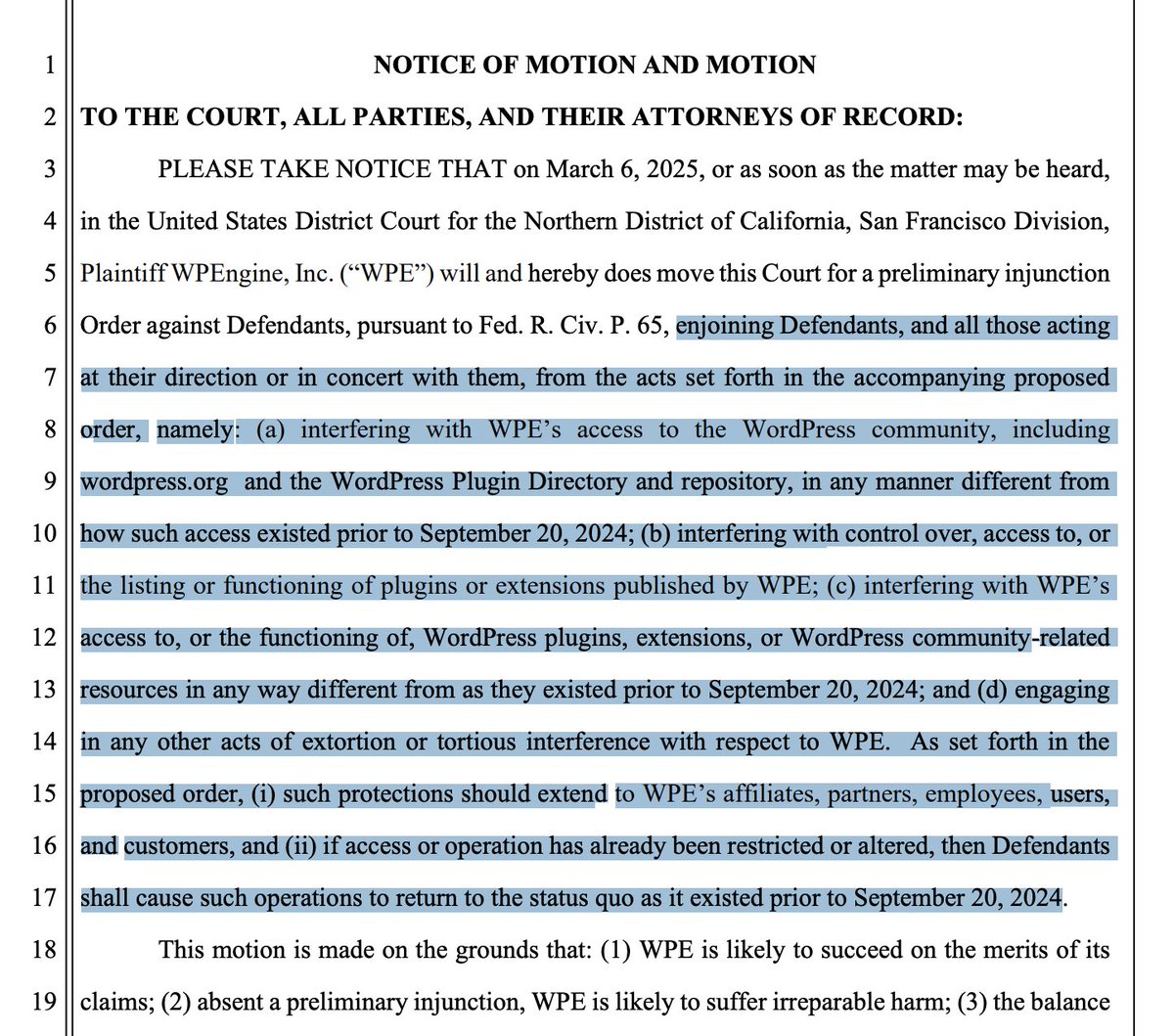 Looks like WPEngine just filed a motion for preliminary injunction against @photomatt and @automattic