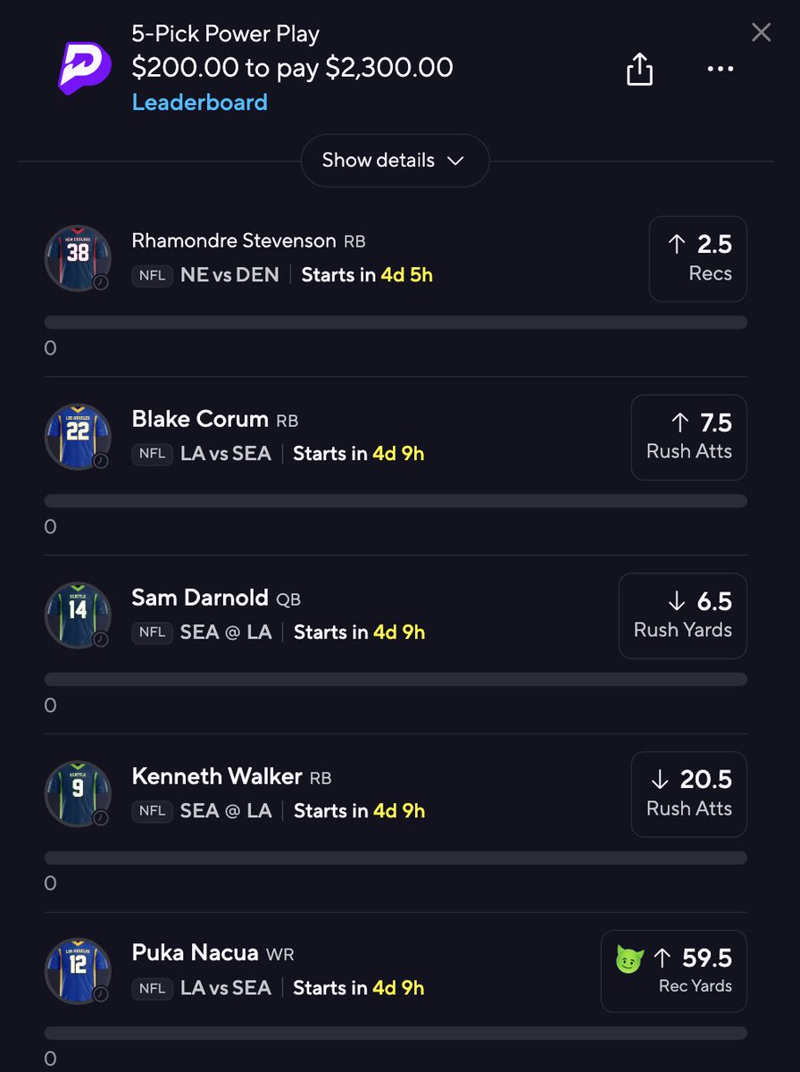 Here are 5 picks you can take right now to turn $20 into $230: Pick 5: Puka Nacua More Than 59.5 yards