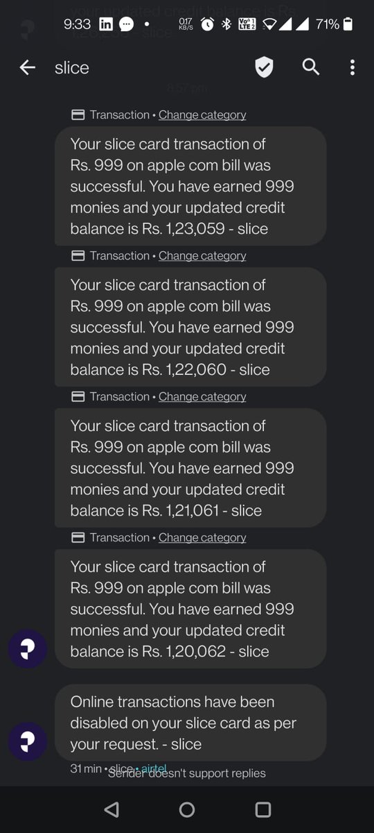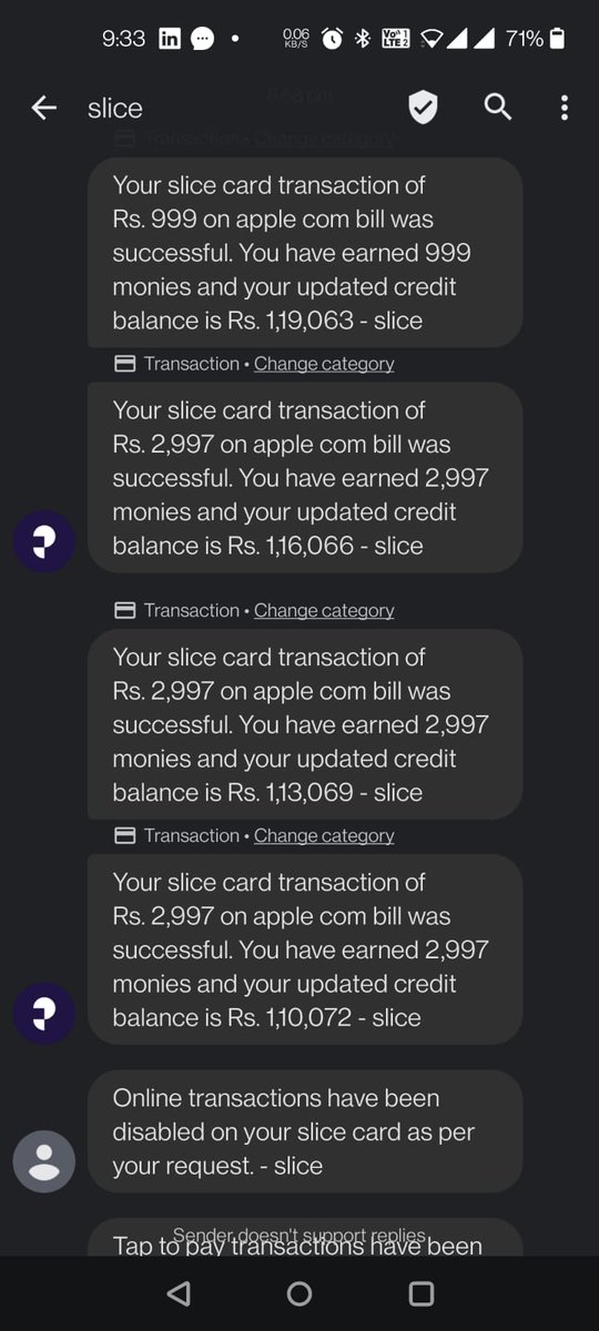 @sliceit_ There have been 8 illegal transactions from my card of Rs. 13,986 within a span of 3 minutes (8:56PM to 8:59PM) on March 26. The transactions were made while I was driving and the card was with me the entire time and I didn't receive a single OTP. @sliceit_ The customer care is only available from Monday to Friday. Does slice believe that credit card fraud happens only on weekdays? Every time the SMS regarding the illegal transaction came on my mobile there was no provision to report the same.