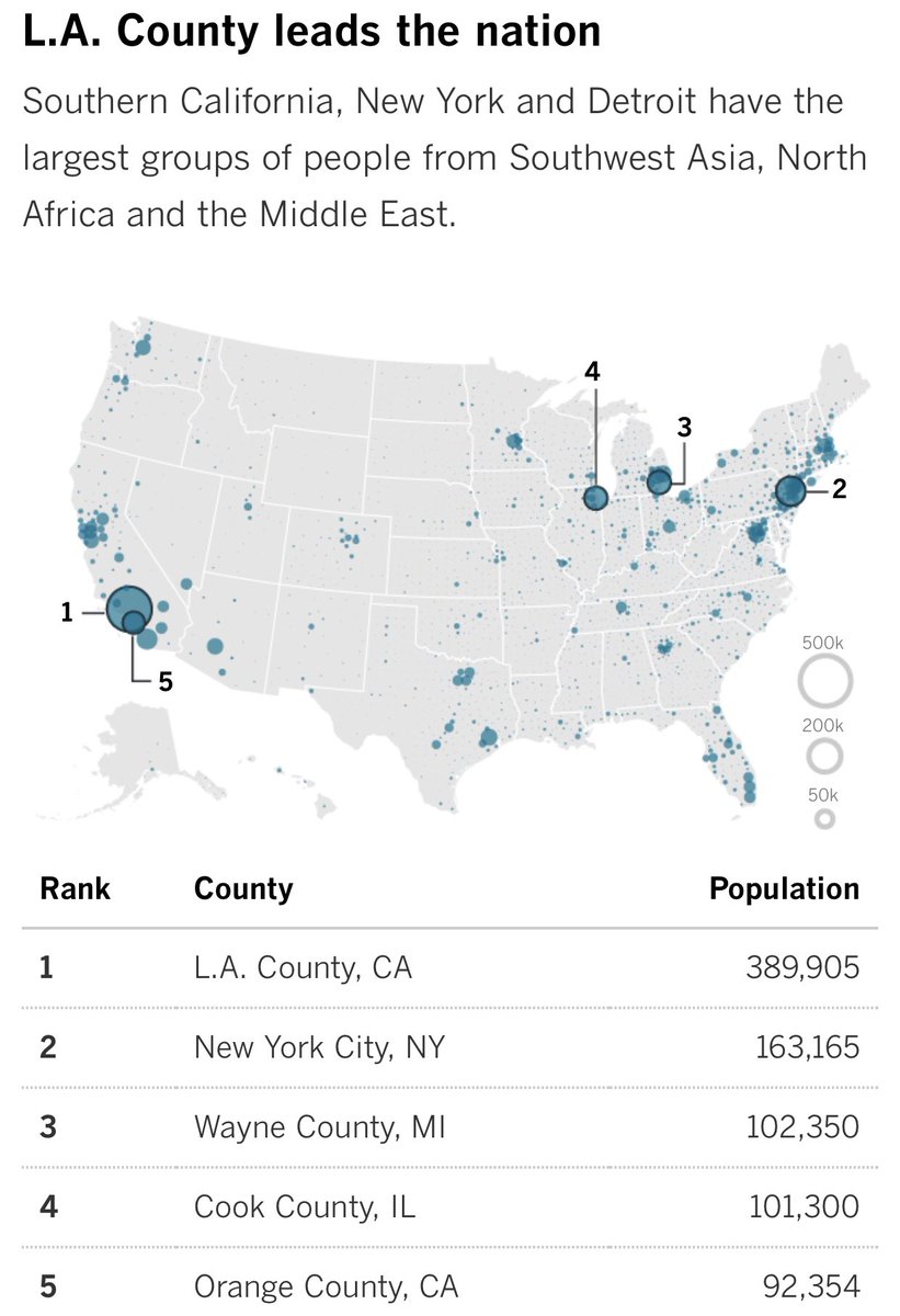 Roughly 3 million people of Southwest Asian, Middle Eastern or North African descent live in the United States, according to an analysis of U.S. Census Bureau data by @emsimani. No county is home to more of these communities than Los Angeles, with more than 350,000:
