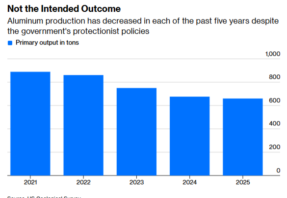 Over the last decade, the US has imposed a layered, global tariff wall on aluminum & aluminum products. Imports predictably declined, yet they're still 60% of US consumption and US smelters have kept closing - even with blanket tariffs of 50%! /2