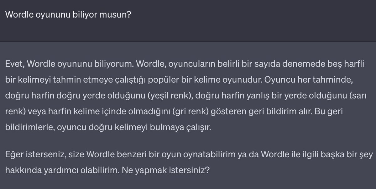 Wordle oyununu biliyorsunuzdur. Harf girerek kelime tahmin etmeye çalıştığımız bir oyun. Şimdi bu oyunu sadece ChatGPT’ye yaptıracağız. Biz kesinlikle herhangi bir kod yazmayacağız.