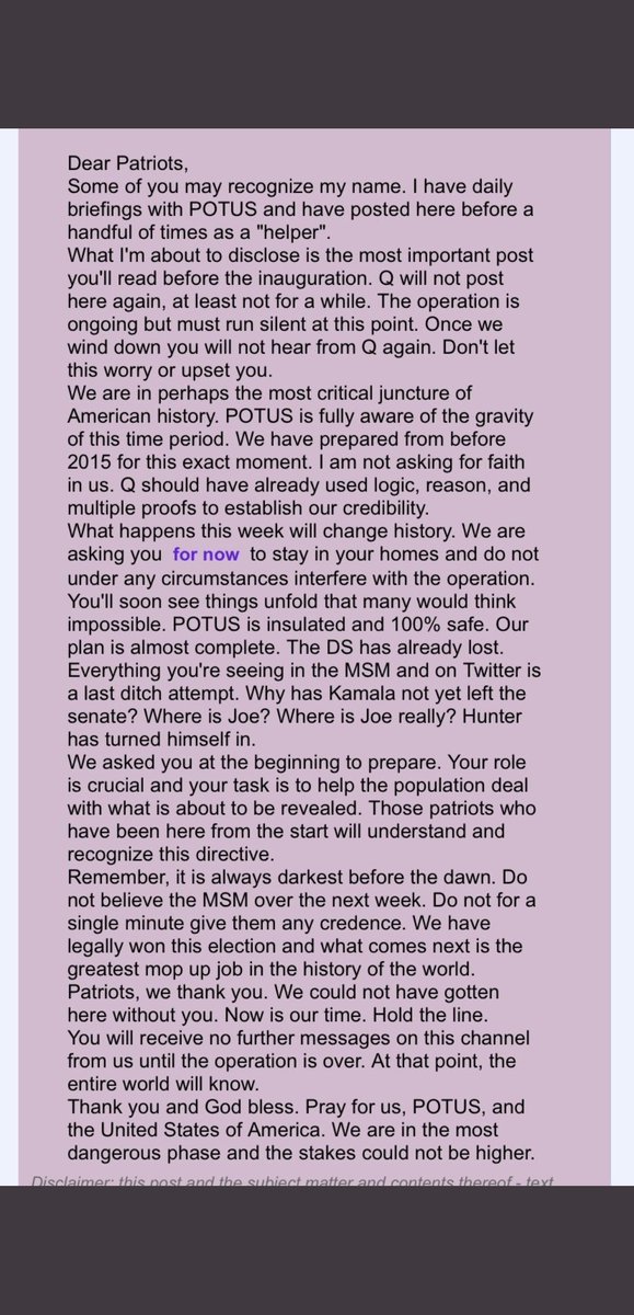 "...Q não postará mais aqui novamente, pelo menos não por um bom tempo. A operação está em curso, mas deve correr em silêncio a partir desse ponto. Uma vez que terminarmos, vc ñ ouvirá sobre Q novamente. Não se assustem ou fiquem chateados. Estamos, talvez no momento"... #QAnon