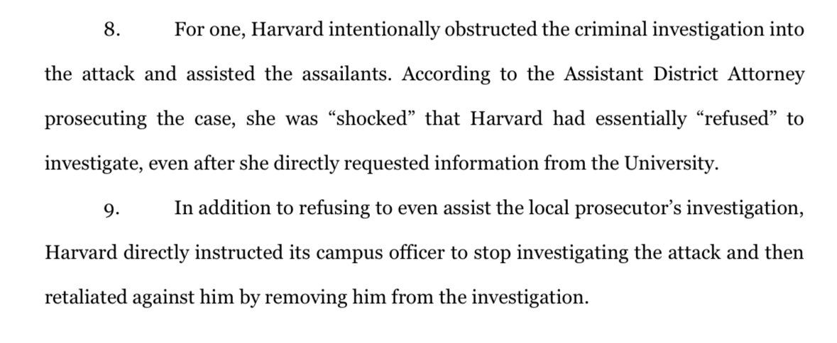 He alleges, “In addition to refusing to even assist the local prosecutor's investigation, Harvard directly instructed its campus officer to stop investigating the attack and then retaliated against him by removing him from the investigation.”