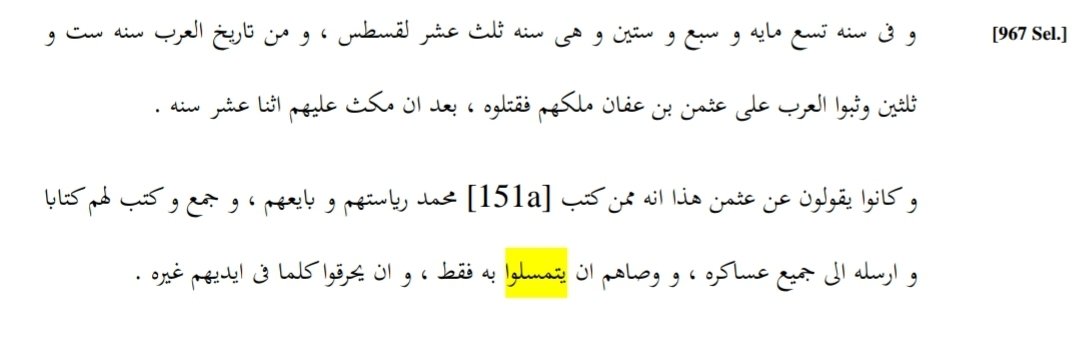 Translation: "They said of this ʿUthmān that he wrote from the writings of Muḥammad, their prophet, and gathered and compiled for them a book, and sent it to all his armies, commanding them to adhere to it alone and to burn whatever else was in their hands." (1/3)