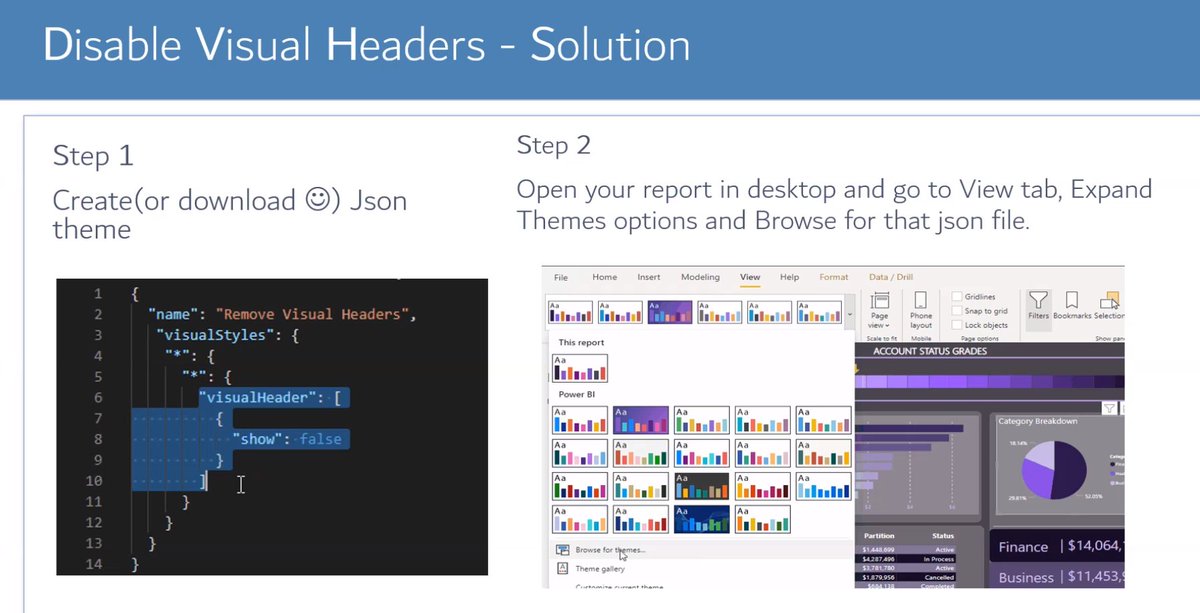 #powerbi tips and tricks comin atcha in this thread - thanks Alina! starting with: disable ALL visual headers at one time using a teeny little code snippet!