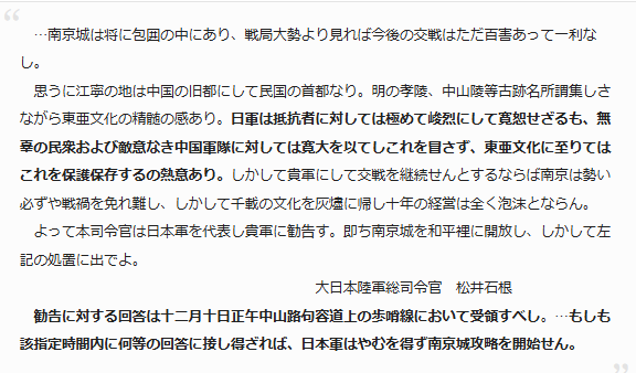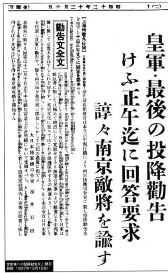 そして12月9日に飛行機にて南京城内の中国軍に降伏勧告文を撒布し、翌10日正午までの回答を要求した。勧告文の全文は新聞にも報じられている。
