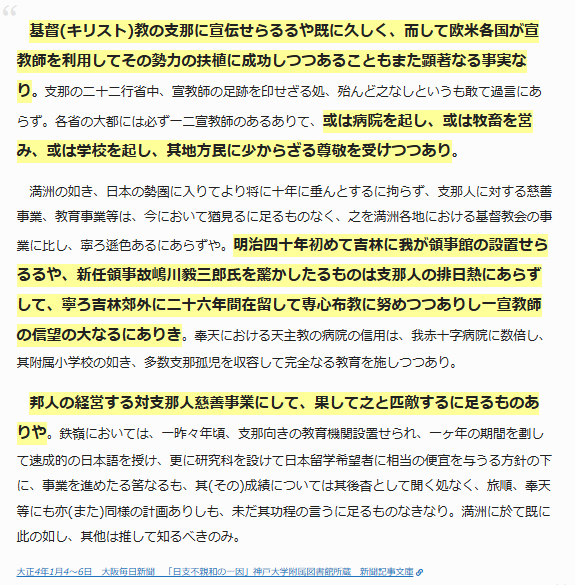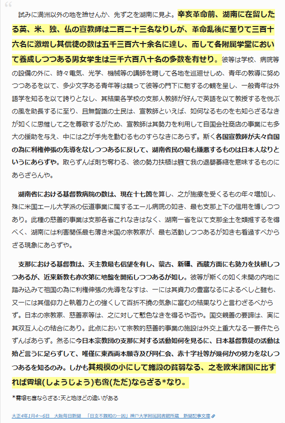 欧米列国は権益を手にするや宣教師を送り込み、病院や学校を建設して地元民との交流をはかりながらそれなりの効果が出ていたという。では欧米列強はどの程度の宣教師を送り込んだのであろうか。この記事には、続いてこう記されている。