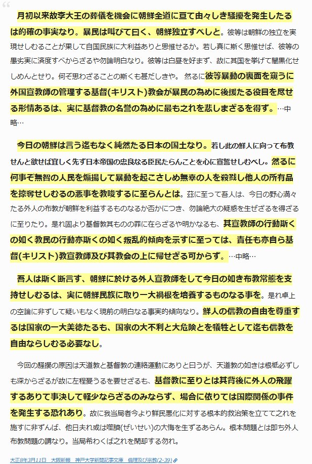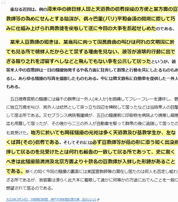 いくら日本人が善政を行ったとしても、もし朝鮮人が「独立」して善政を行うことが出来る力があるならば、「独立」が良いと考えるのが当たり前だ。要するにアメリカ人宣教師は、「独立」という魔法の言葉を用いて、日韓の分断をはかろうとしたのだ。
