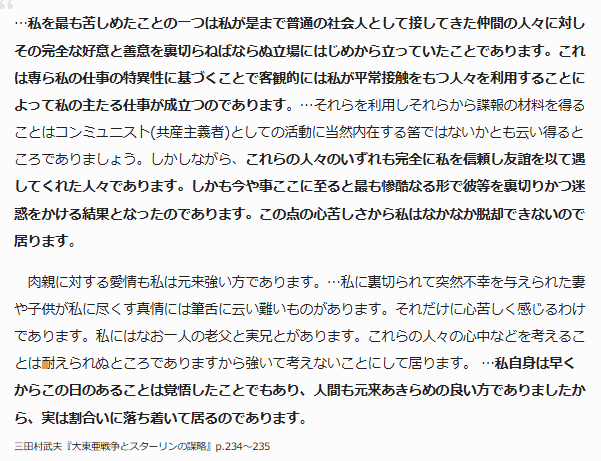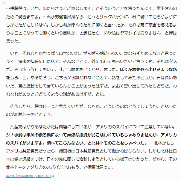 実はこの北林トモという女性がゾルゲ事件の発端になるのだが、宮下は伊藤の話を聞いて、これはコミンテルンのアメリカ支部、つまりはソ連のスパイだと直感した。この段階では宮下も、この女性がゾルゲや尾崎に繋がるとは考えていなかったが、宮下は上司の了解を得て伊藤を釈放した