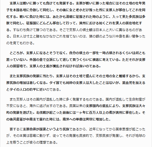 長野朗はさらに、支那民族=漢民族が数千年にわたり周辺の民族を侵略し得たのは、「支那が農業の民であるのに、周辺の民は多くは牧畜又は遊牧をやっていたからで、牧畜は農業に敵わないのである。…鍬を大地に打ち込んだものは永久に土と結着して動かない。」と書いている。