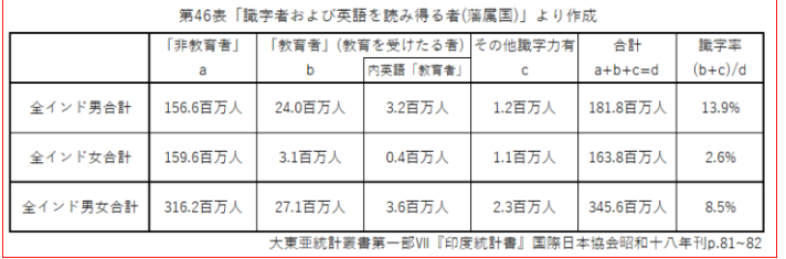 全インドの識字率が8.5%という数字から、9%とするボースの主張が正しいことがわかる。2百年前の識字率は6割だったという主張については統計がないので確認不能だが、かつてのインドは歴史的に見ても極めて豊かな国であった。GHQの焚書処分を受けたラインハルト・フランクの『虐げられし印度』にはこう書かれている。