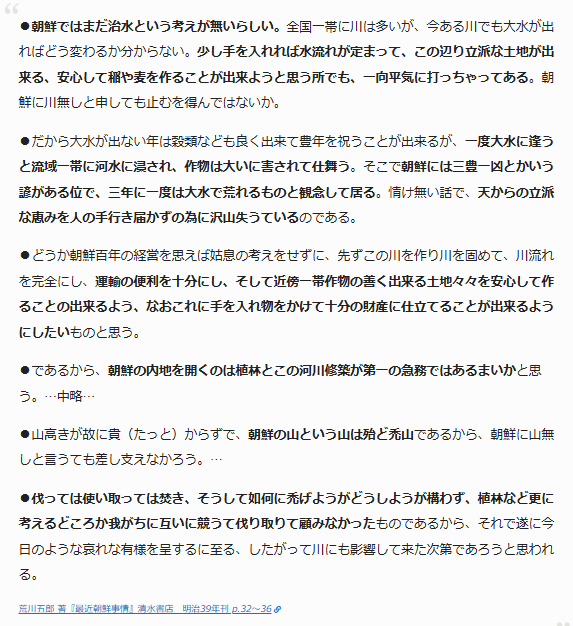 人々が煮炊きや暖房のために木を伐っていけば、計画的に植林をしない限り、いずれどの山も禿山とならざるを得ないのだが、確かに当時の朝鮮の写真で確認できる山は禿山ばかりである。