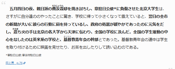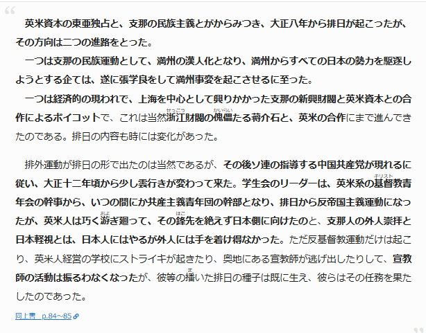 第一次世界大戦後のヴェルサイユ講和条約で山東省におけるドイツの利権をわが国が承継することが決まったのだが、北京大学の学生らが条約調印に反対する運動を起こしたことがきっかけとなって、排日運動が支那全土に波及していった。ところがこの運動には、東亜の市場を狙っていた英米が仕掛けたというのである。