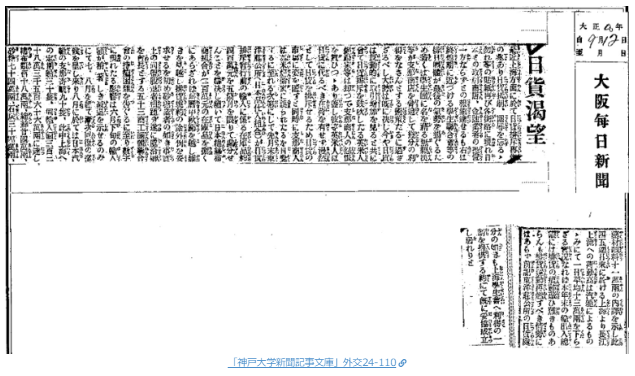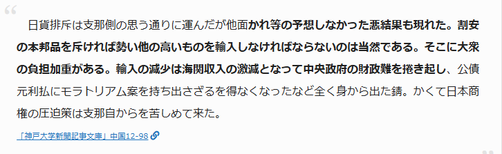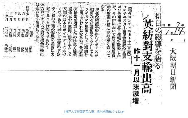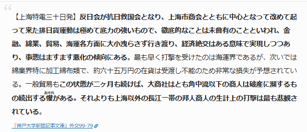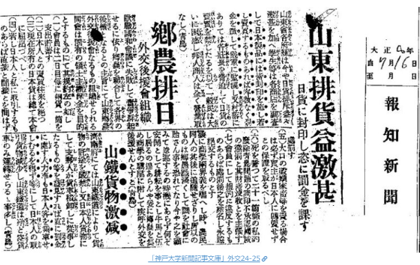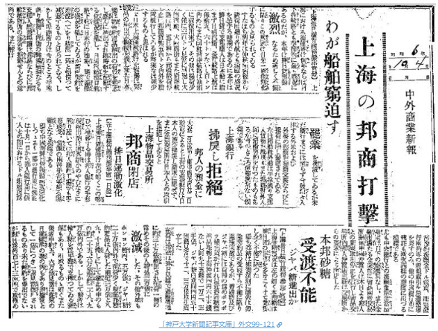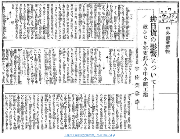 柳条湖事件からまだ日も浅い昭和六年十月一日の大阪朝日新聞の記事には、今までになく日貨排斥が徹底されるようになり、日本商人が大きな打撃を受けていることを報じている。