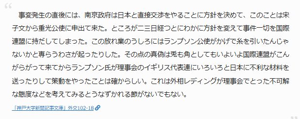 昭和六年十一月三日の東京朝日新聞は、ランプソン公使が張学良や蒋介石と提携して動いていたことを報じ、満州事変後に支那がわが国と直接交渉せずいきなり国際連盟に訴えたり、その後の国際連盟の不可解な動きは、この人物が策動していた可能性を示唆している。