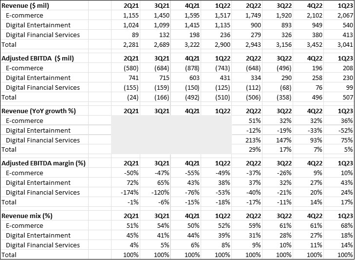 1. Firstly, as of 1Q23, revenue growth in e-commerce accelerated to 36% while adjusted EBITDA margin improved from -49% in the prior year to 10% in 1Q23.