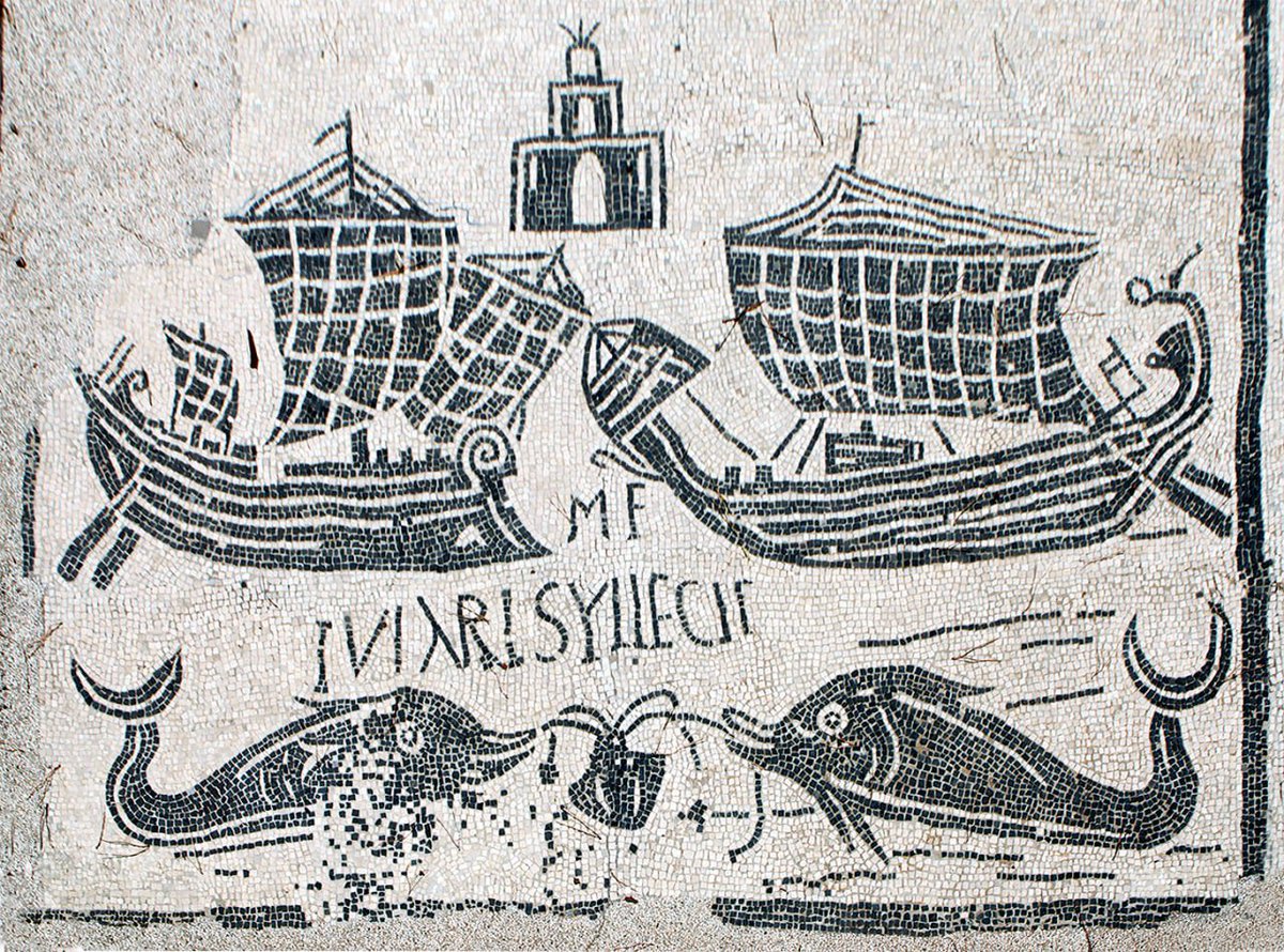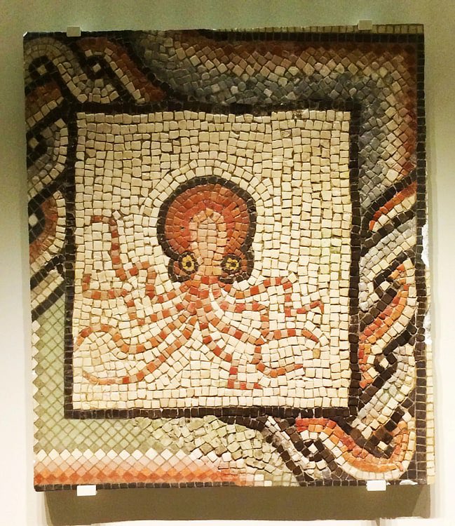 Как видите, техника исполнения мозаичных полотен не всегда была изощренной. Вот эта мозаика из порта Остии была выполнена за 200-300 лет до осьминога. Прогресс на лицо!