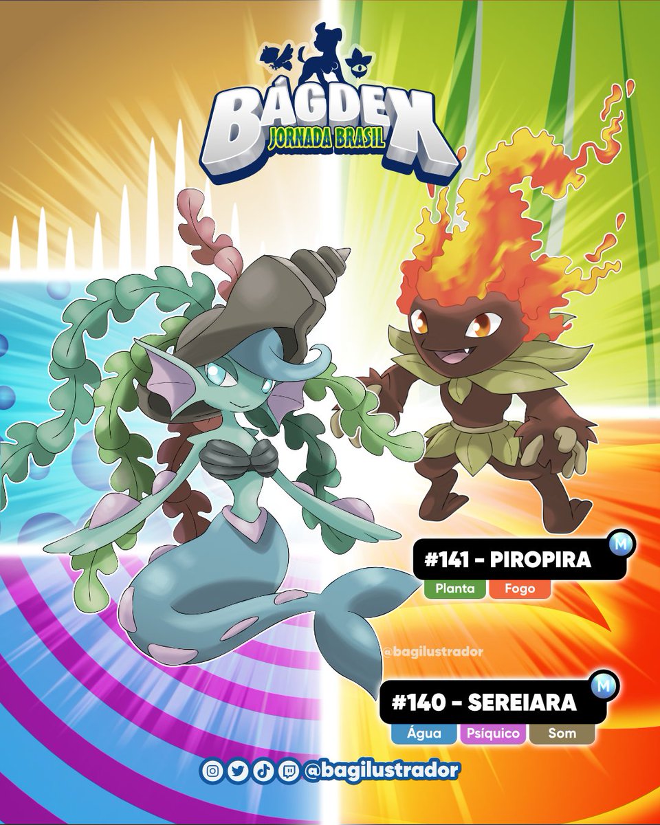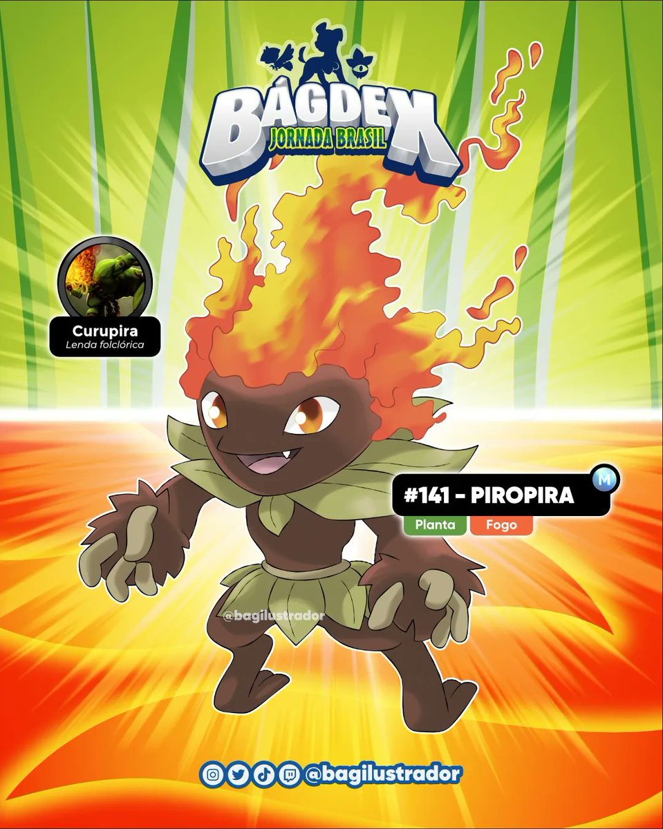 🔥 Piropira (piro = fogo) é o Bágmon protetor das matas e de todos os Bágmon da floresta. Sua tipagem incomum lhe permite proteger a todos que precisam. Ele é rápido e silencioso, corre, salta e balança pelas árvores como nenhum outro Bágmon!