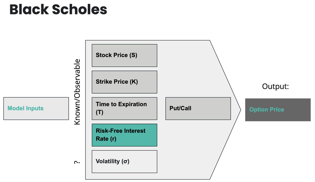 The foundation of options pricing, black scholes, uses the following inputs: