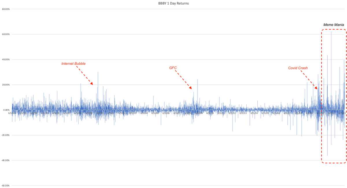 Over those 30 years, there have been some volatile times for BBBY, namely 00's bubble, '09 GFC and '20 Covid Crash.
